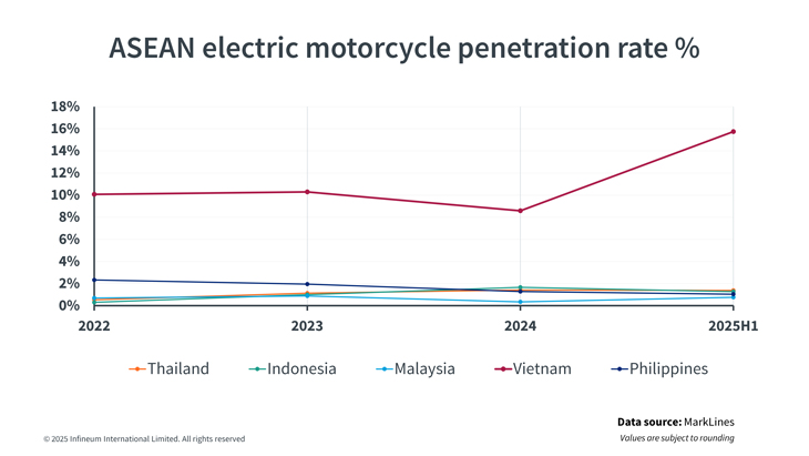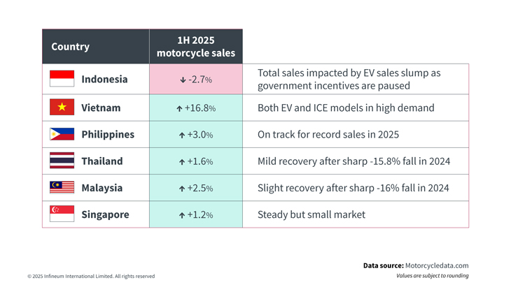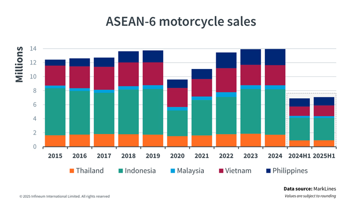 Some 70% of vehicles on ASEAN roads are two-wheelers and the whole region accounts for some 30% of the global motorcycle market, led by Indonesia and Vietnam. The market experienced strong growth in 2024, with the Philippines leading the region with a 7% sales growth.