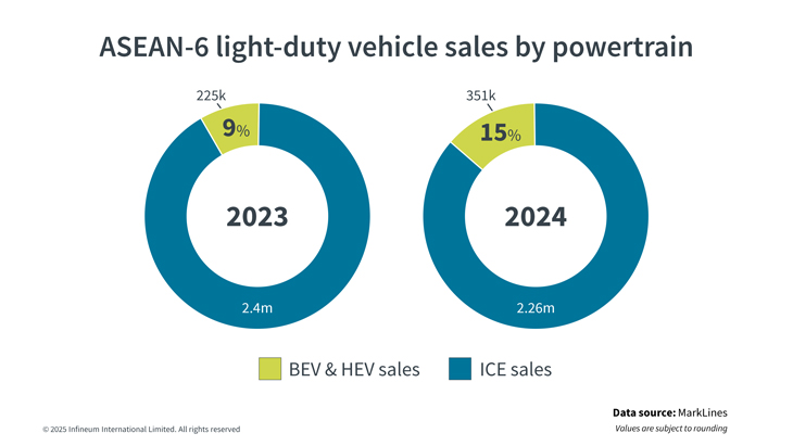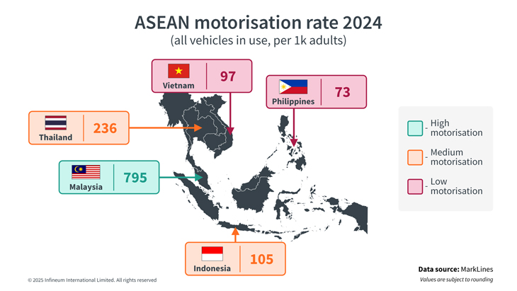 In some countries, sales are being driven by EV incentives, lower interest rates, competitive pricing and new product launches, while in others they are constrained by higher household debt, tighter lending and global trade headwinds. In Thailand and Indonesia, for example, vehicle sales plunged in 2024 as tighter lending and economic uncertainty took hold. Malaysia overtook Thailand as the bloc’s second largest market. At the same time, Vietnam and Singapore experienced strong sales growth, driven by registration fee and interest rate cuts in the former and Certificate of Entitlement adjustments in the latter.