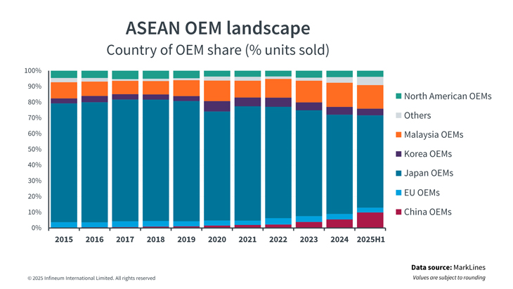 In Indonesia, Thailand and the Philippines, Japanese OEMs hold more than 75% of the market. However, Chinese OEMs, such as BYD, Chery and SAIC, are showing strong growth and aggressive expansion in Thailand and Singapore as consumer preference shifts towards electrified vehicles and these OEMs offer affordable, cutting-edge options. Other OEMs, including Volkswagen, Hyundai, Kia, GM and Ford, are experiencing a decline in demand, while local OEMs, such as Malaysia’s national brands Perodua and Proton and Vietnam’s VinFast, have been gaining overall market share.