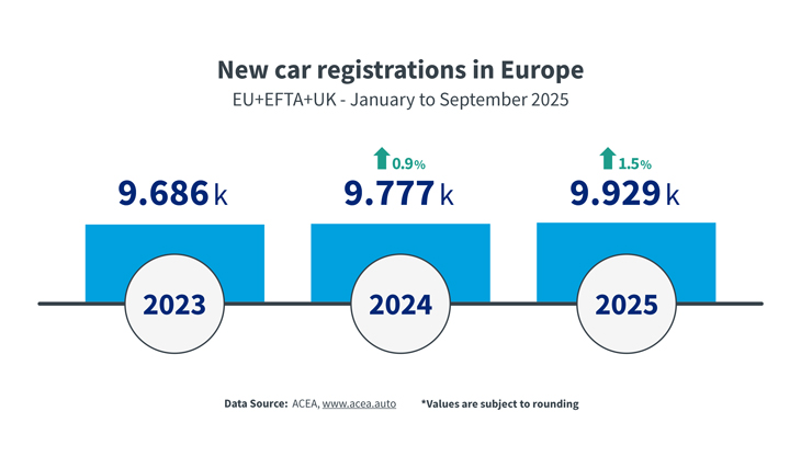 To set the scene, let’s look at the current market situation, before going on to explore the changes in policy, the competitive landscape and future outlook. At the time of writing, January to September 2025 data were available for new car registrations in Europe and these have been used throughout this article. New car registrations in the European market - comprising the European Union, the EFTA states (Iceland, Norway, and Switzerland), and the United Kingdom - reached 9.29 million in the first nine months of 2025. Strong growth in September means volumes increased by 1.5% compared to the same period last year.