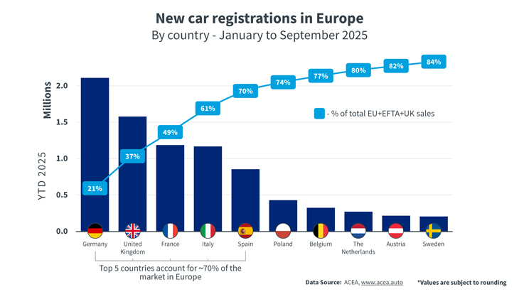 Regional differences remain stark. Germany retains its position as Europe’s largest market, followed by the UK, France, and Italy. These four account for 60% of Europe’s new registrations, and the top five countries cover close to 70% of the European car market.