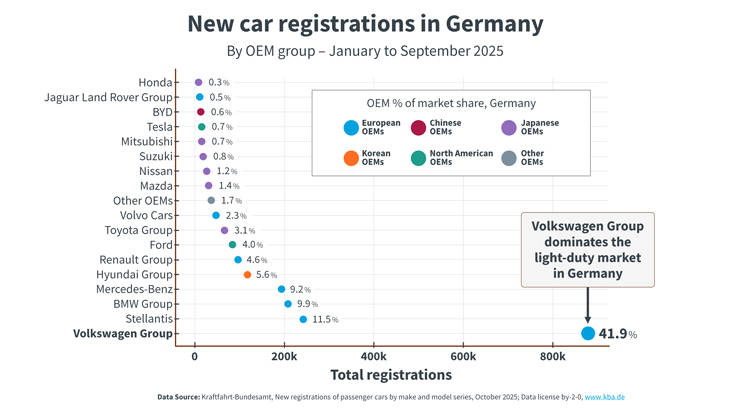 In Germany, Europe’s largest market, Volkswagen’s leadership is even more pronounced, with sales almost four times higher than its nearest competitor. As shown below, the share of 'Other OEMs' in the overall German market remains well below 2%.