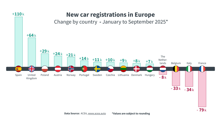 Relative to the same period last year, Spain saw the strongest growth with nearly 110,000 additional registrations, whereas France recorded the most significant decline with 72,000 fewer vehicles.