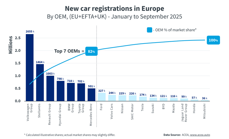 Hyundai, BMW, and Toyota form a strong mid-field with market shares around 7-8%. Mercedes-Benz stands at approximately 5%, bringing the combined European market share of the mentioned OEMs above the 80% mark.