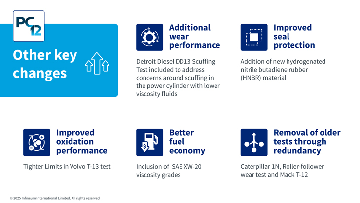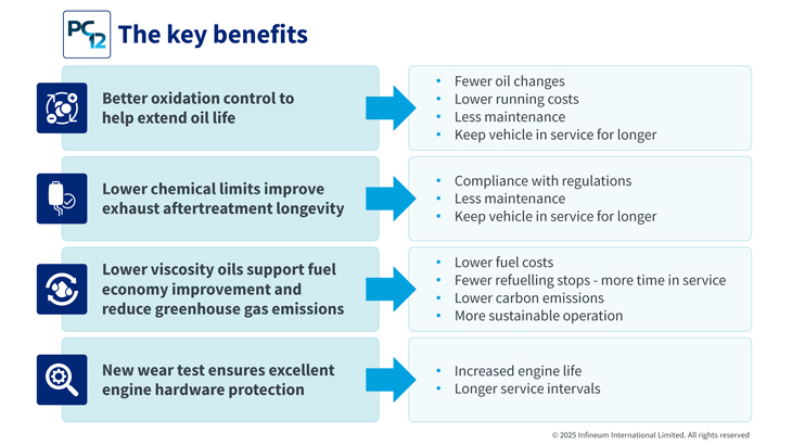 In addition, to ensuring hardware durability over longer periods, the introduction of a new category provides a good opportunity to enhance lubricant performance in other areas such as longer oil drain intervals, improved fuel economy and better engine deposit protection. In our view PC-12 will deliver benefits in several key areas.