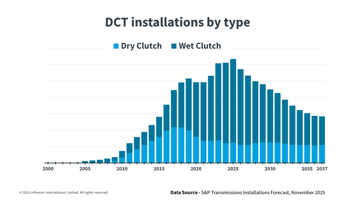 In 2024, according to the European Automobile Manufacturers’ Association (ACEA), 75.5 million cars were produced across the globe. In the same year, DCT installations peaked at 12 million globally, which means almost 16% of vehicles manufactured that year contained a DCT. Looking out beyond 2025, global DCT installations are expected to decline slightly as the use of dedicated hybrid transmissions in electrified powertrains increases.