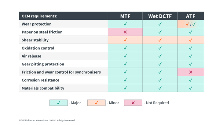 The requirements of dry DCTs can typically be met with conventional manual transmission fluids (MTF). However, wet DCTs, often used in high torque applications, generally require specifically tailored fluids that can deliver: