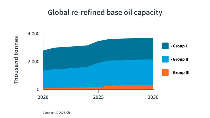 Taking a closer look at re-refined base oils (RRBO), ICIS tracks a 33% growth (~ 1 million tonnes) in global RRBO capacity between 2020 and 2030. While the majority remains at Group I/II quality, enhanced lubricant standards and controlled collection are now allowing a greater percentage of re-refined materials to be at Group III quality.