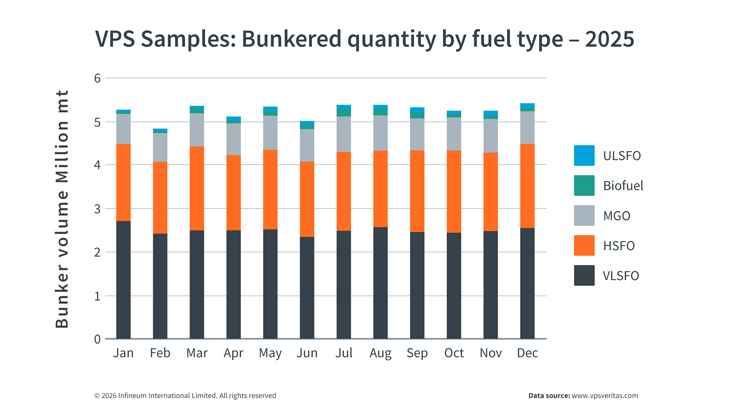 The latest data from Maritime Services Company, VPS, who tested 63 million MT of fuels delivered to ships in 2025, shows that very low sulphur fuel oil (VLSFO) was the year’s most popular marine fuel. Combined, VLSFO, high sulphur fuel oil (HSFO) and marine gas oil (MGO) accounted for 96.4% of fuel used, with biofuels and ultra-low sulphur fuel oil (ULSFO) making up only a small portion.